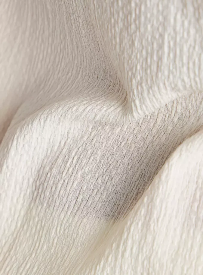 • Material: Linen (with its natural slubs), raw silk, crinkled fabric, velvet, or eyelet embroidery.