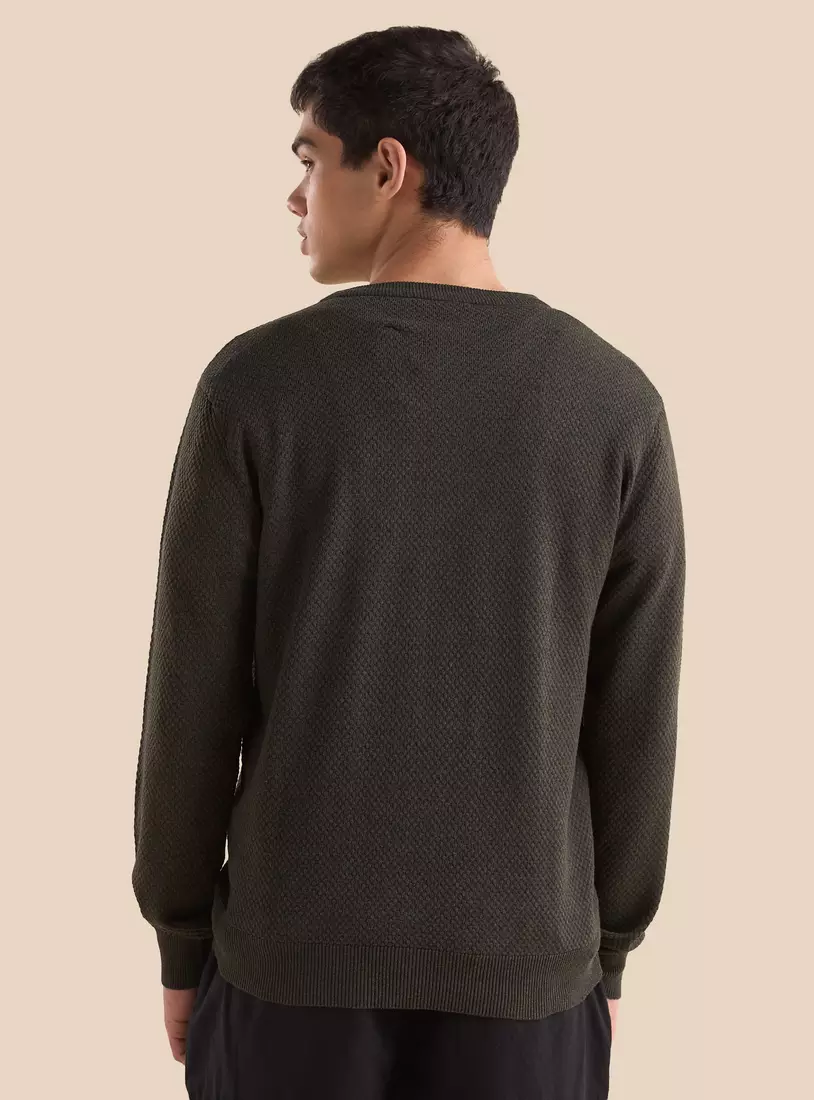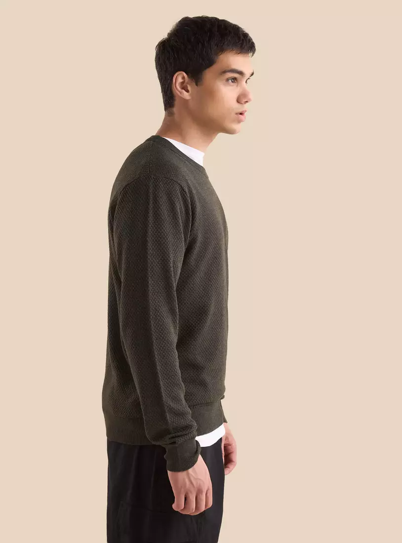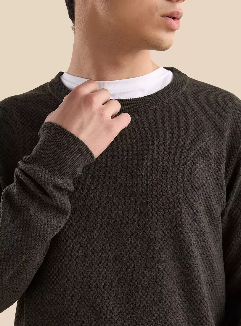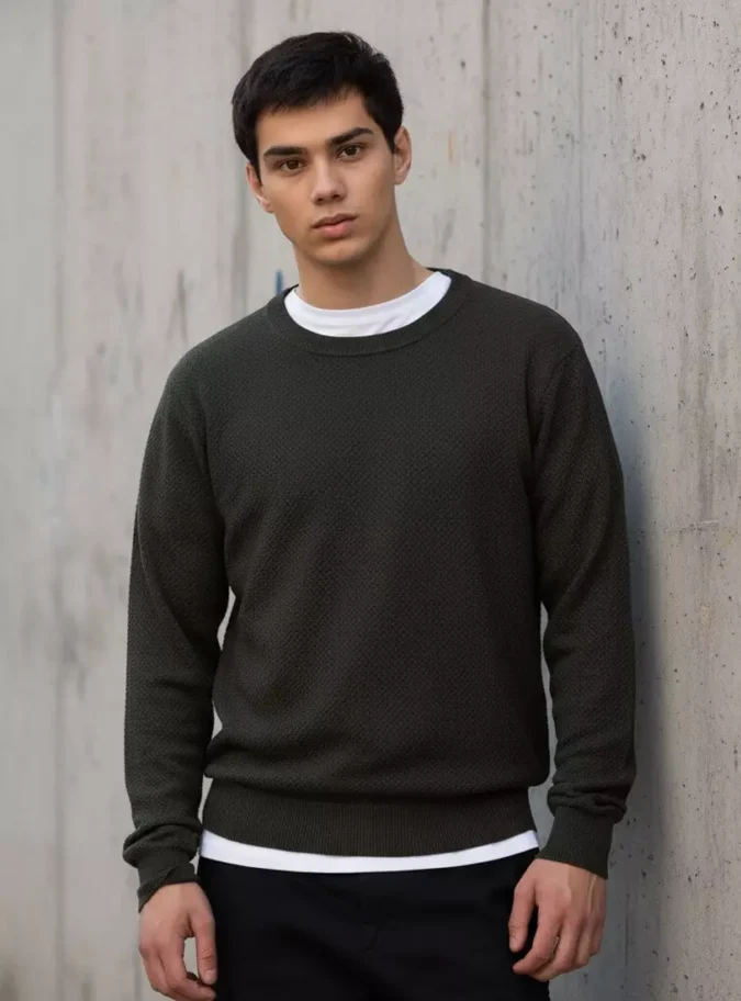 Textured Fabric: The sweater features a subtle yet stylish textured pattern that adds depth and dimension, making it stand out from a traditional knit.