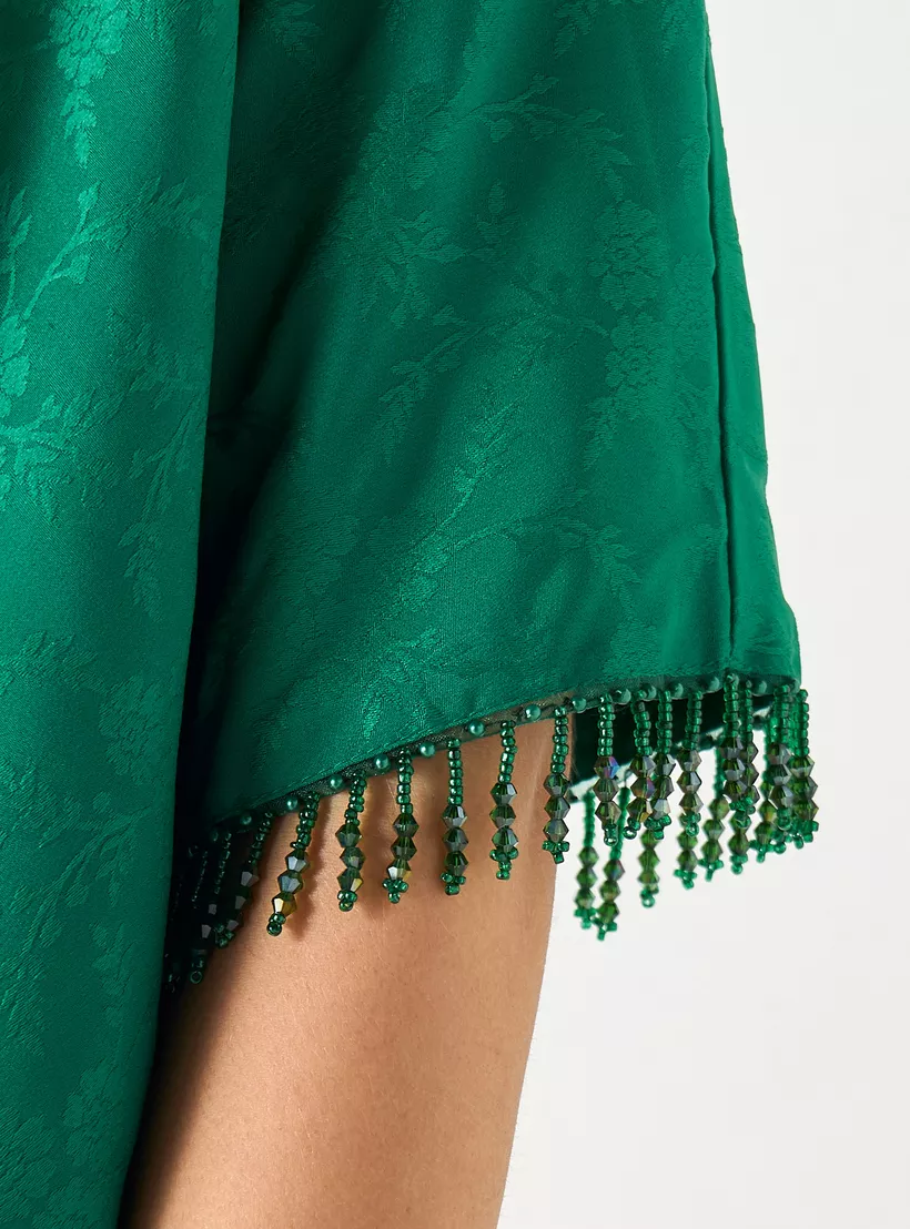 • Textured Fabric: Crafted from rich, textured fabric that adds depth and visual interest to the dress.
