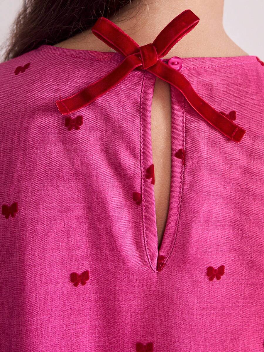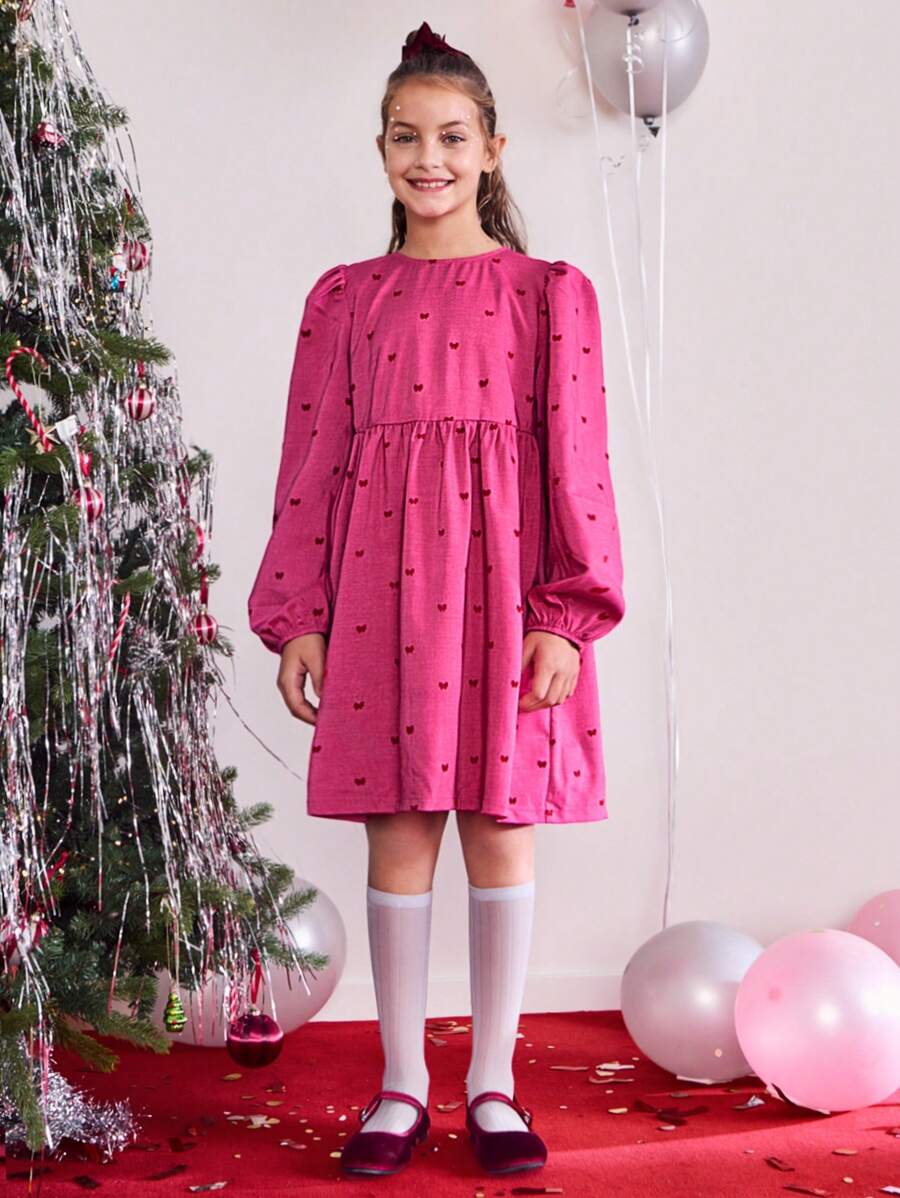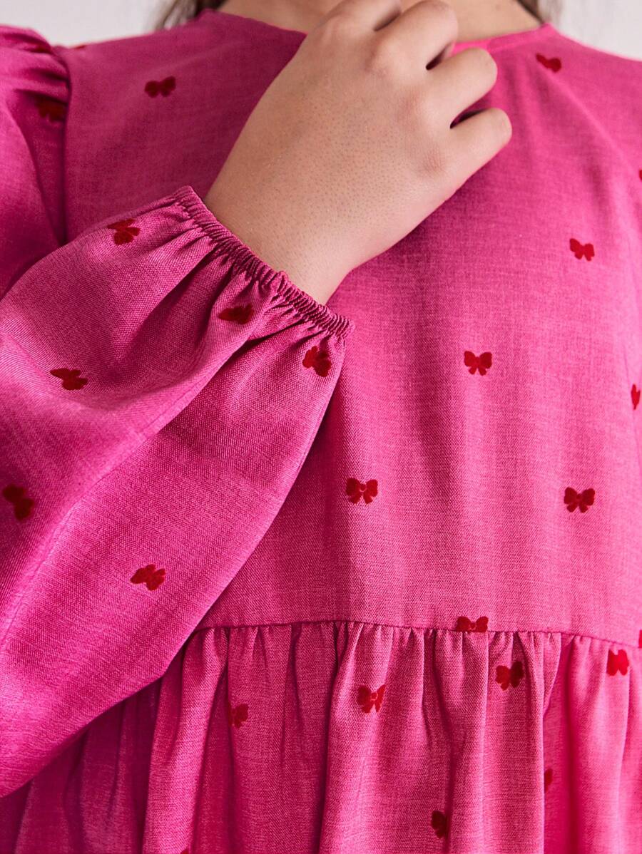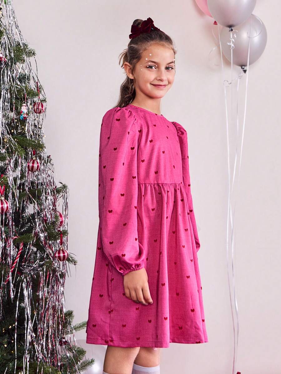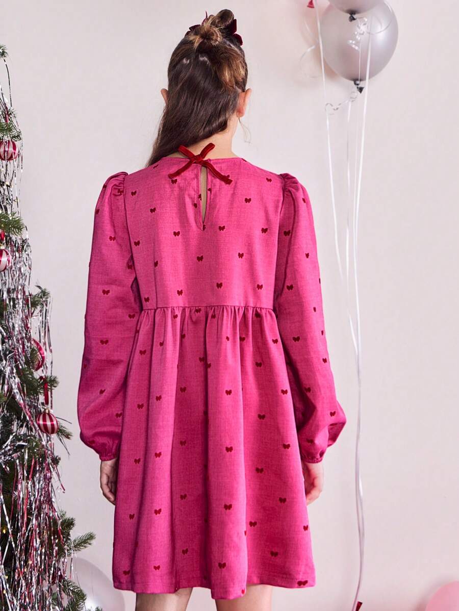 THE HAPPY LOOK Tween Girl Christmas Solid Pink Cute Bow Flocked Round Neck Lantern Sleeve Dress, Fall/Winter