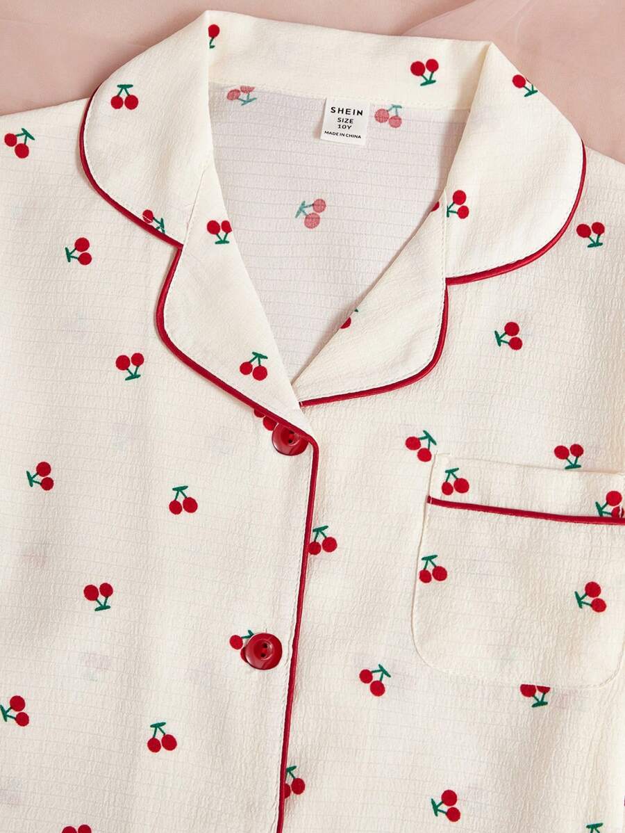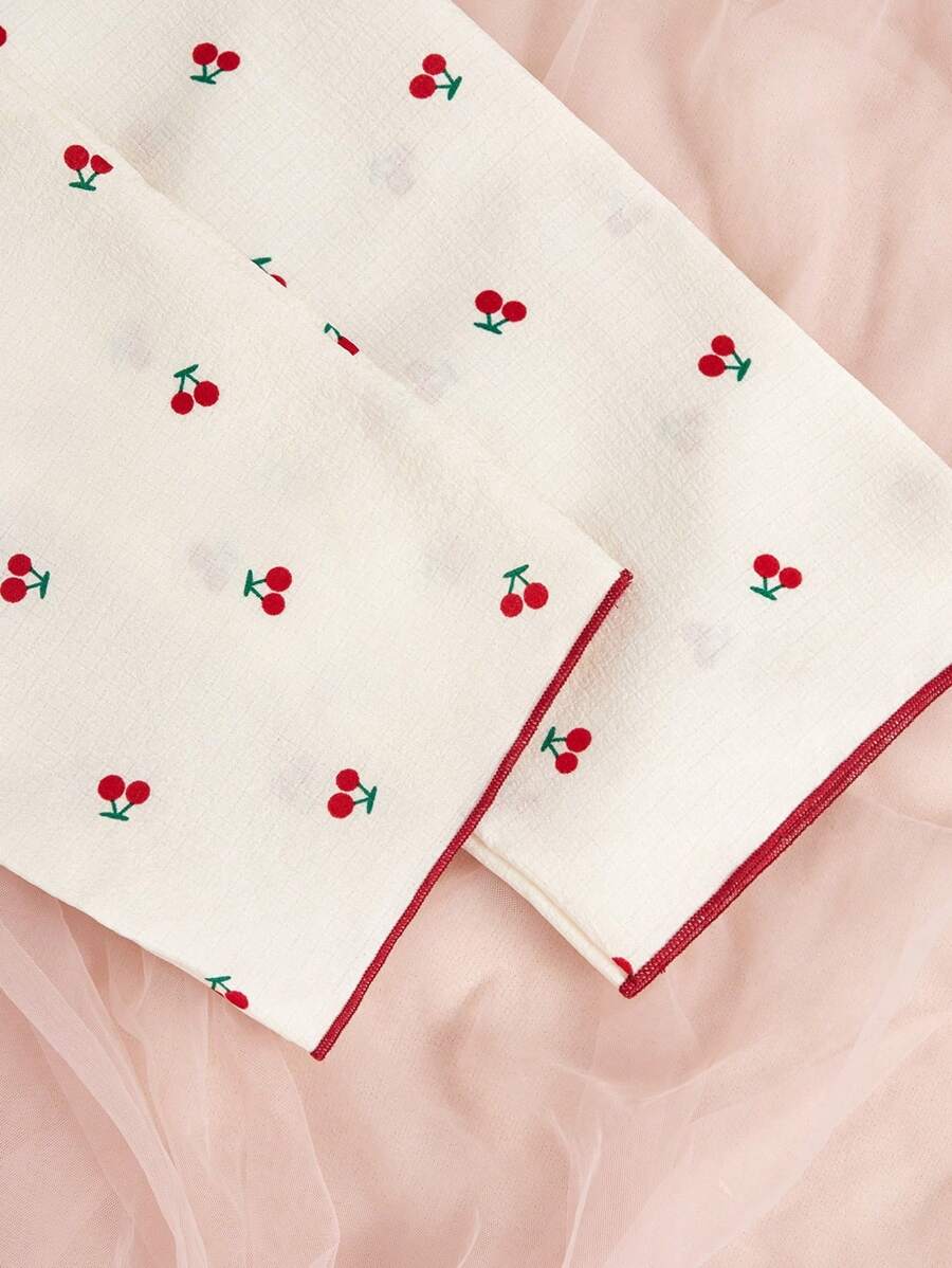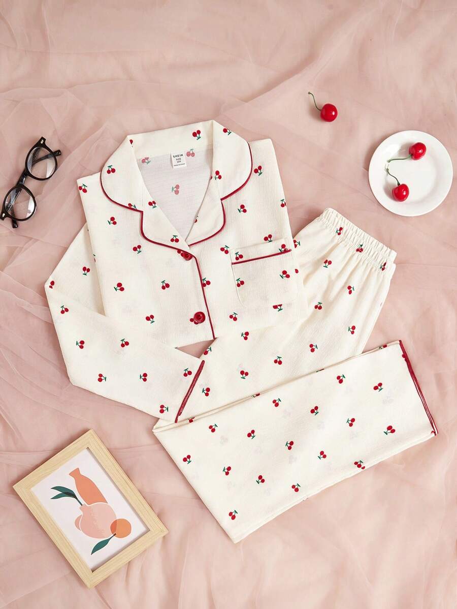 Tween Girl 2pcs/Set Schoolgirl Pajama, Peach Color Cherry Printed Long Sleeve Top And Pants Casual Homewear