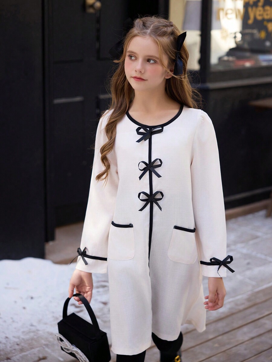 / Tween Girl Apricot Long Sleeve Bow Decor Comfortable Casual Style Pockets Dress, Suitable For Spring And Autumn (Sibling Outfits/Matching Outfits – 2 Pieces Sold Separately)