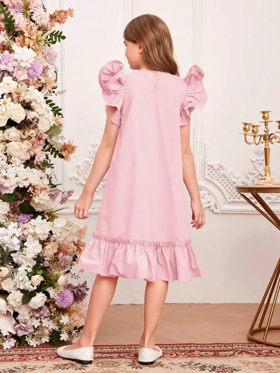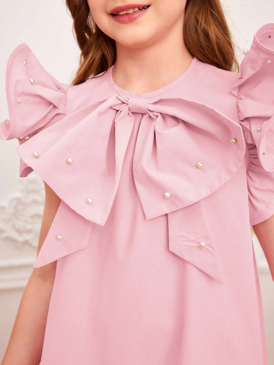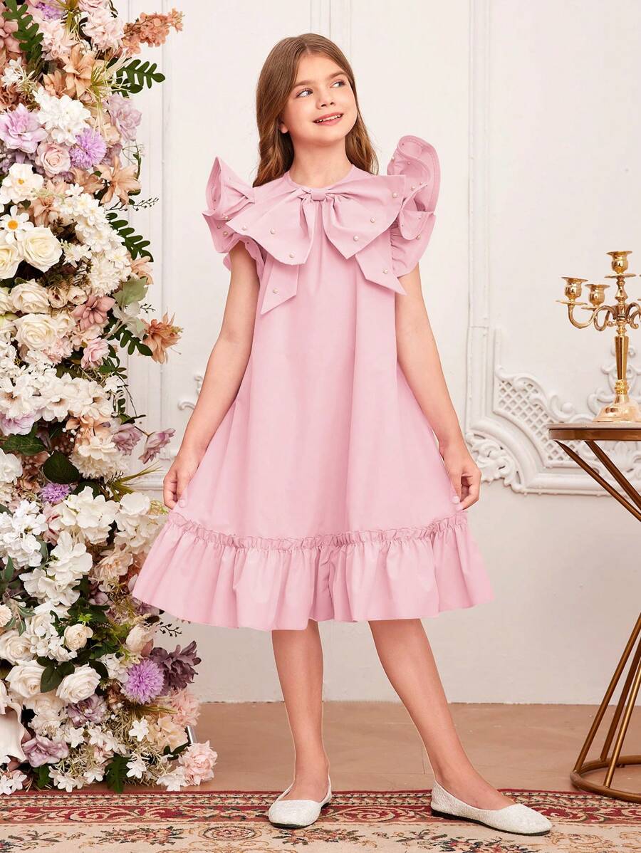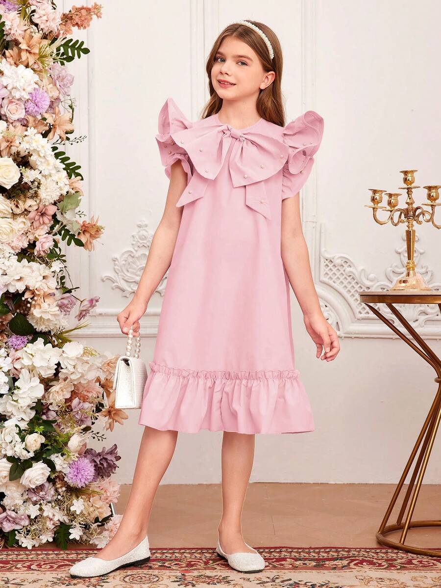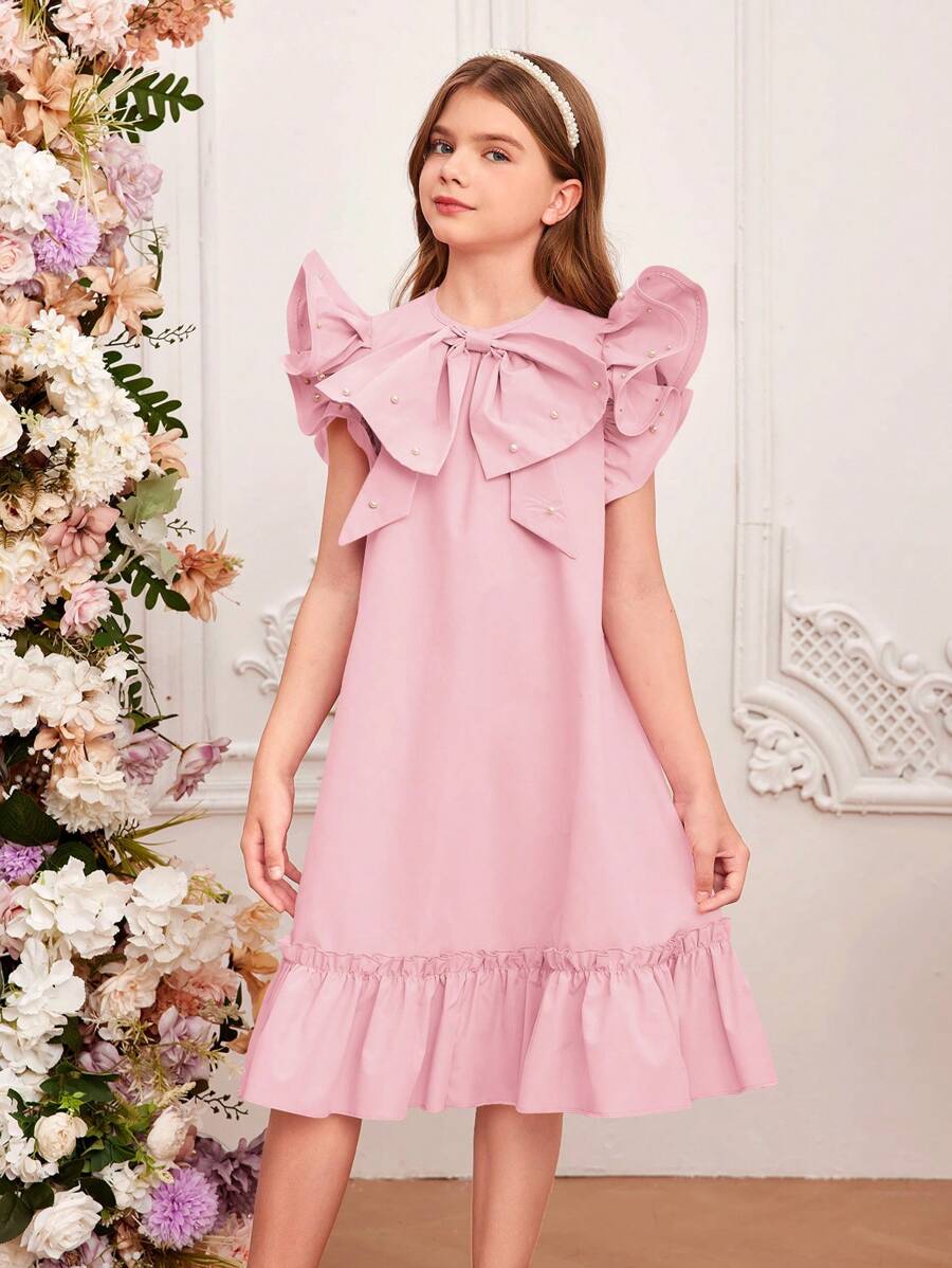 Tween Girl Casual Round Neck Ruffle Sleeve Dress With Big Bowknot, Ruffle Hem And Pearl Decorations