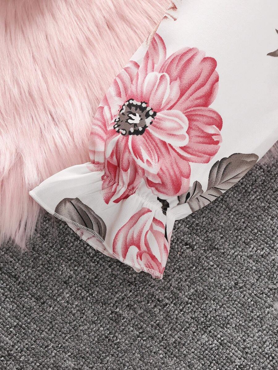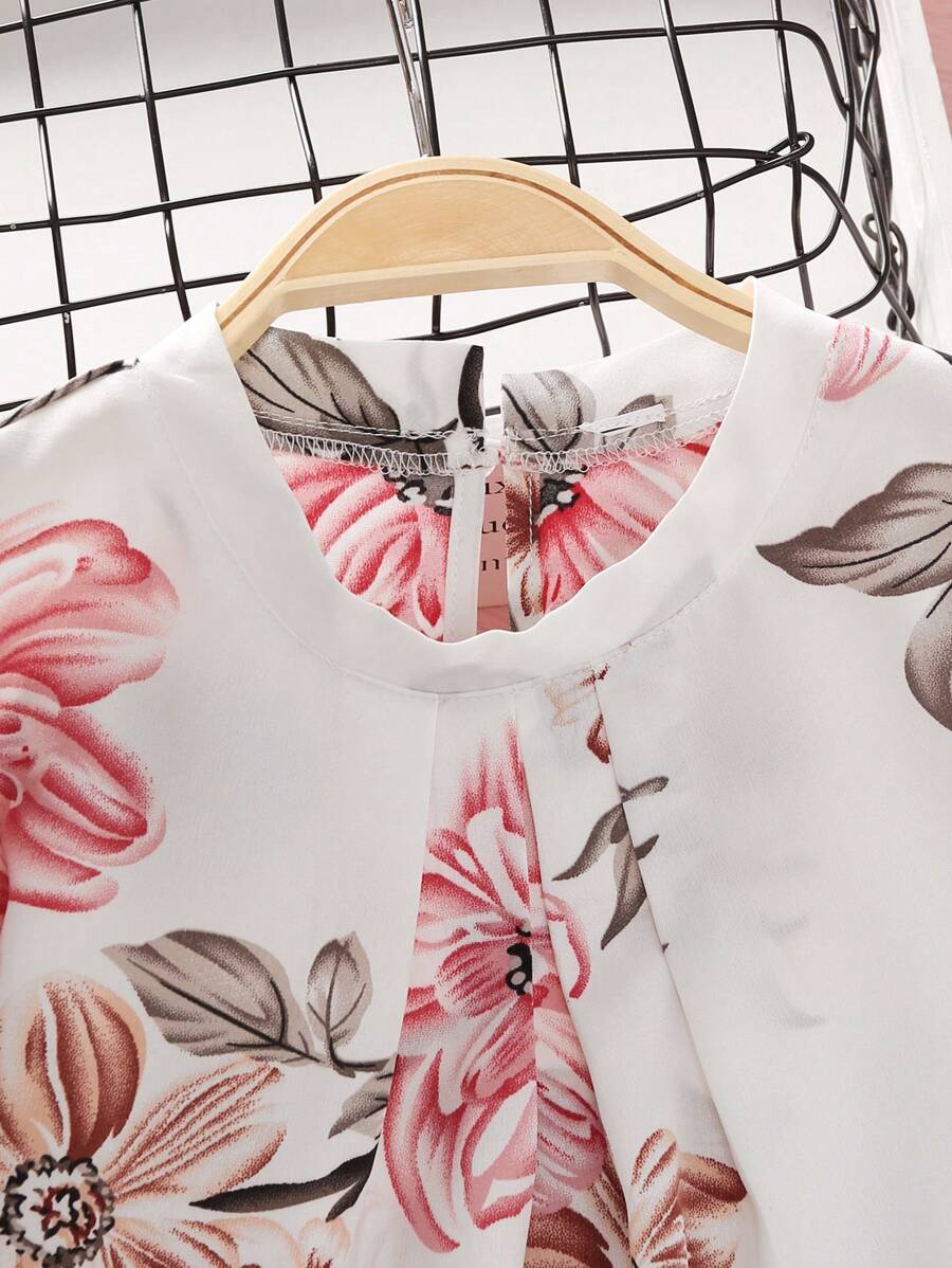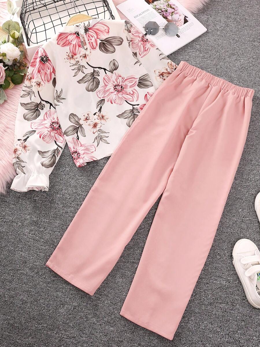 Tween Girl Floral Print Flare Sleeve Blouse & Double Breasted Pants