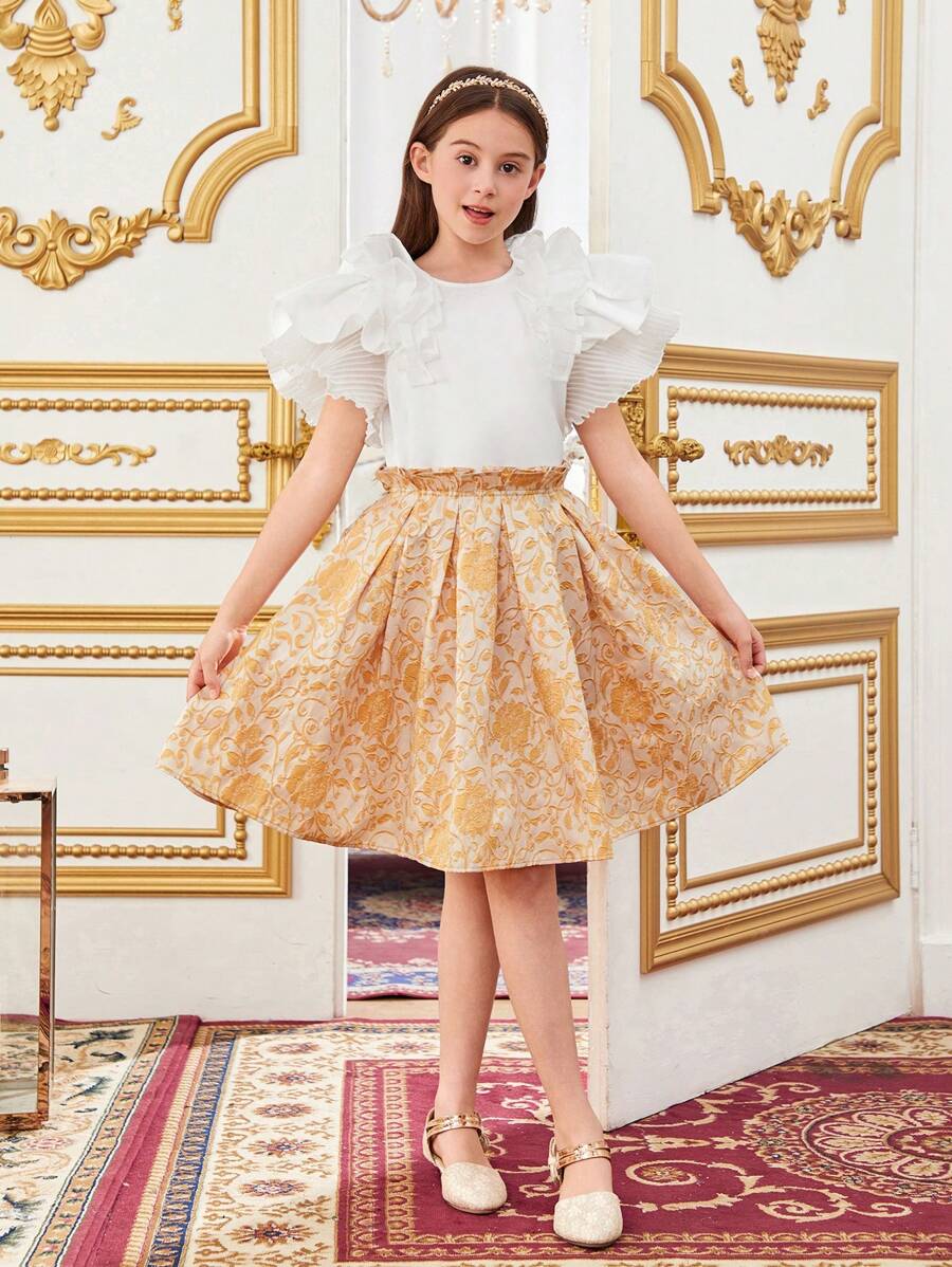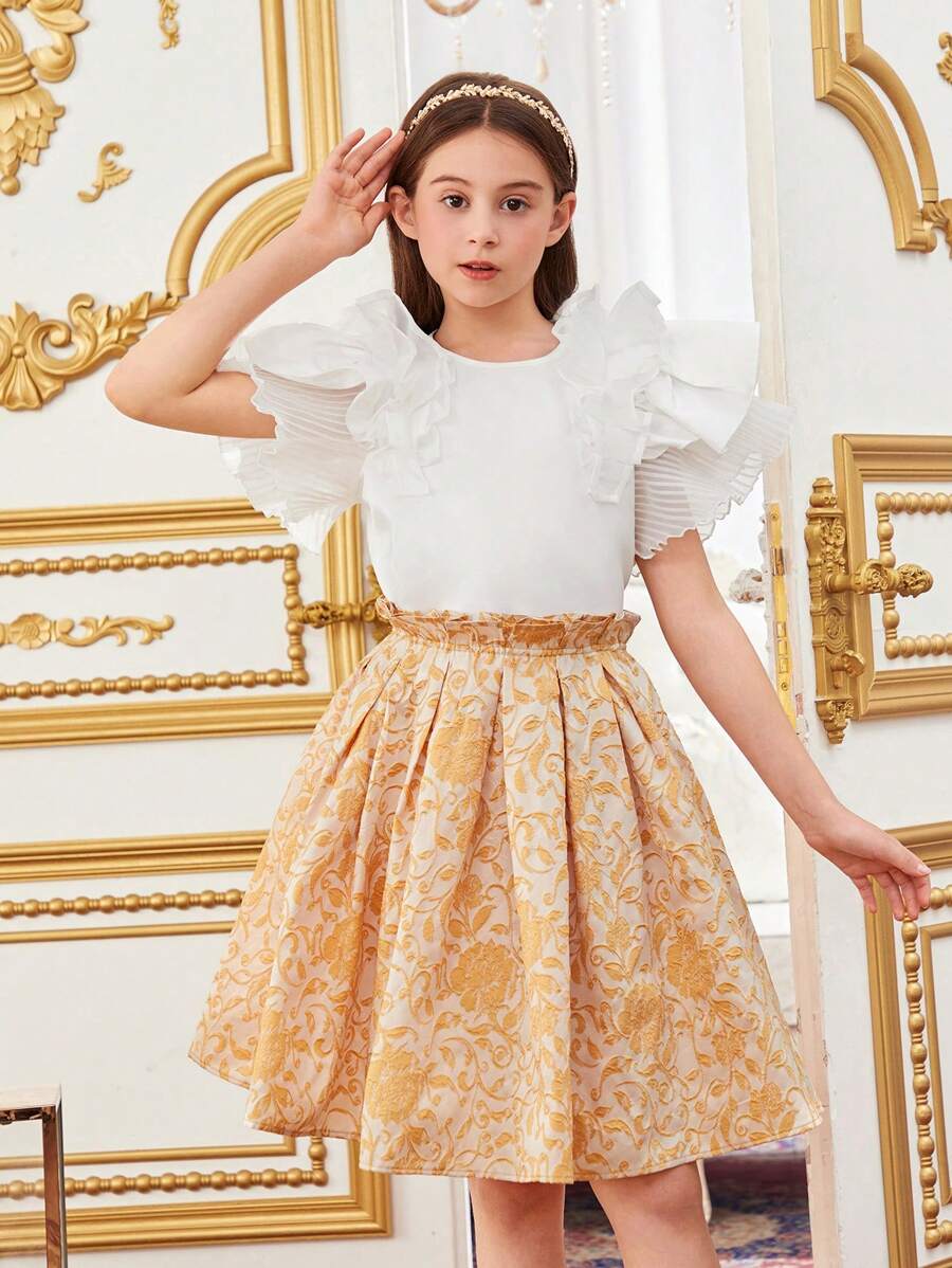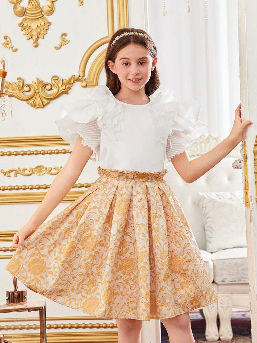 / Tween Girls’ Loose Cute Ruffle Trim Blouse And Skirt Set