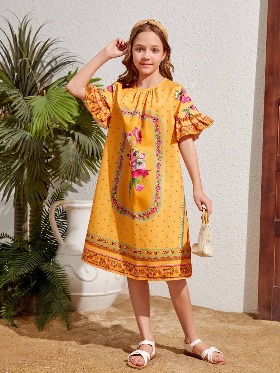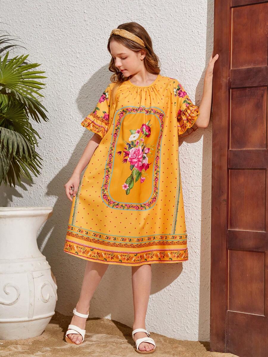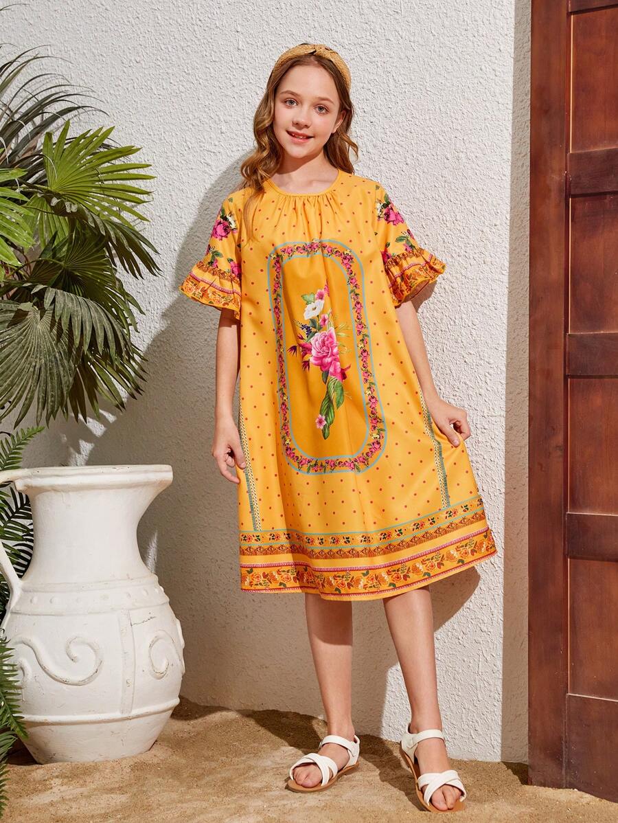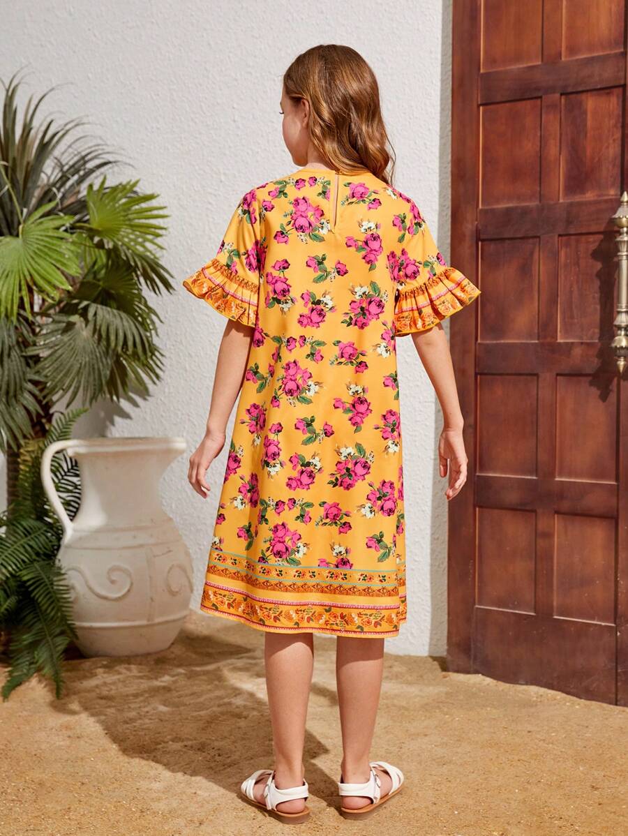 / Tween Girls’ Loose Fit Casual Floral Printed Weave Round Neckline Dress