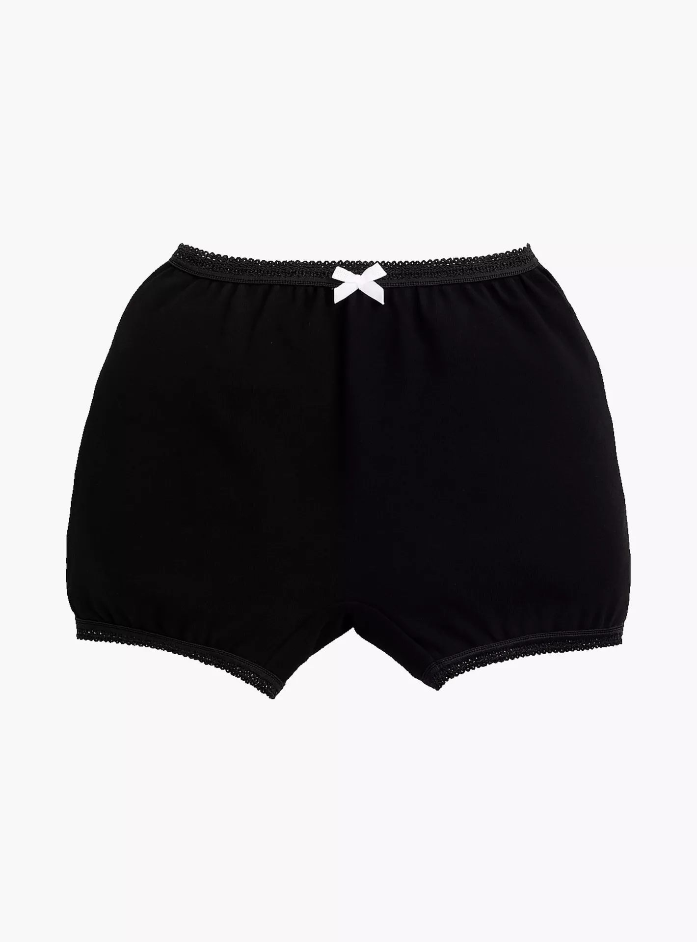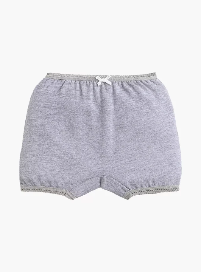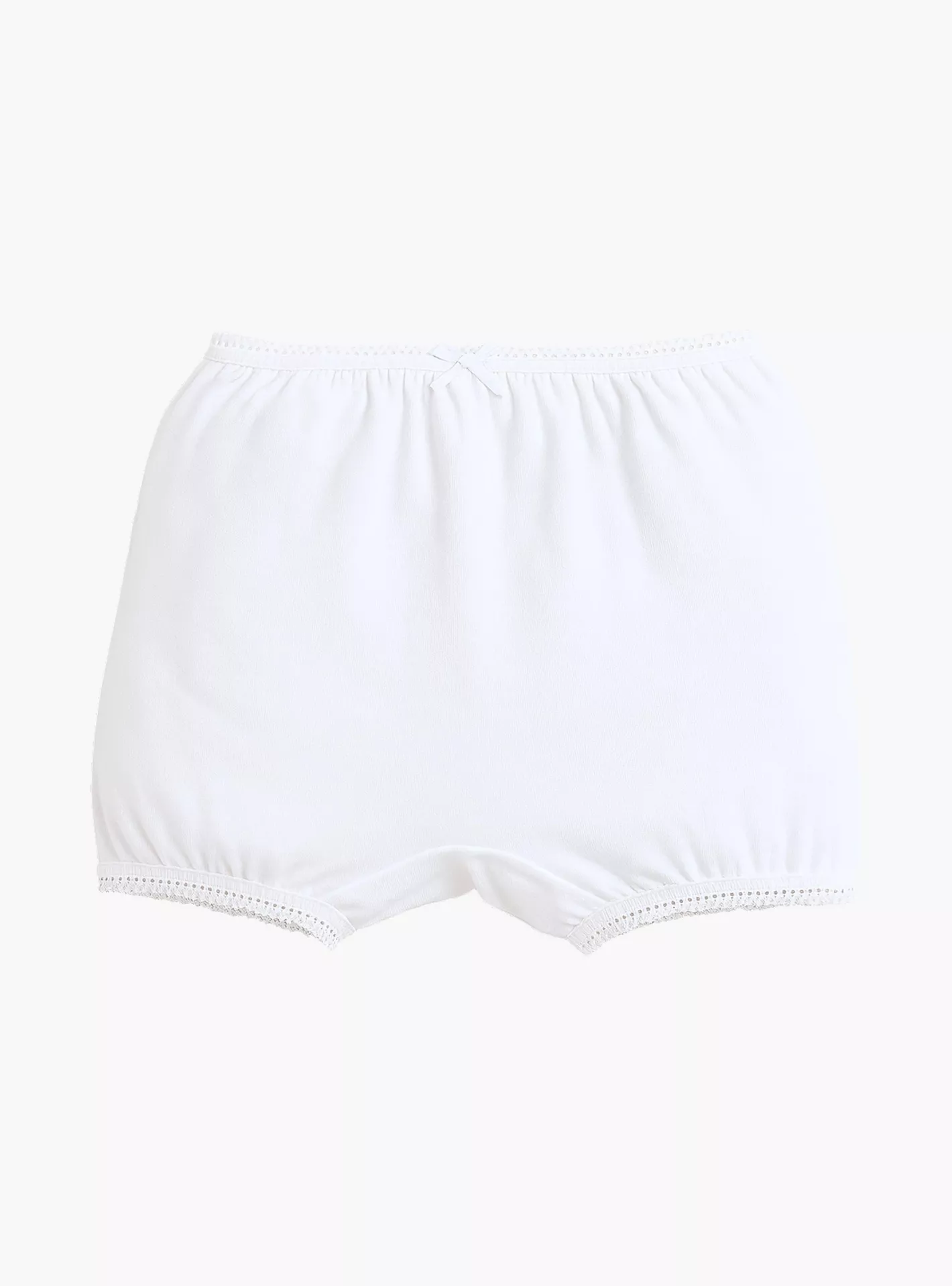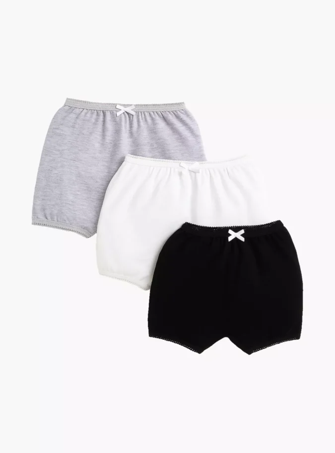 The Victor & Jane 3-Piece Cotton Bloomers is a set of three baby/girl bloomers (underwear/lining shorts) designed for everyday wear. They are made from a soft, breathable cotton blend and come in neutral, easy-to-match colours. Each bloomer features a comfortable elastic waistband for a gentle yet secure fit, with a decorative bow on the front for a cute touch. Ideal for layering under dresses or for use as modesty shorts in warm weather.