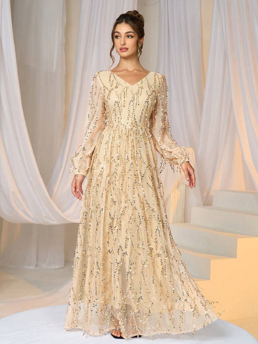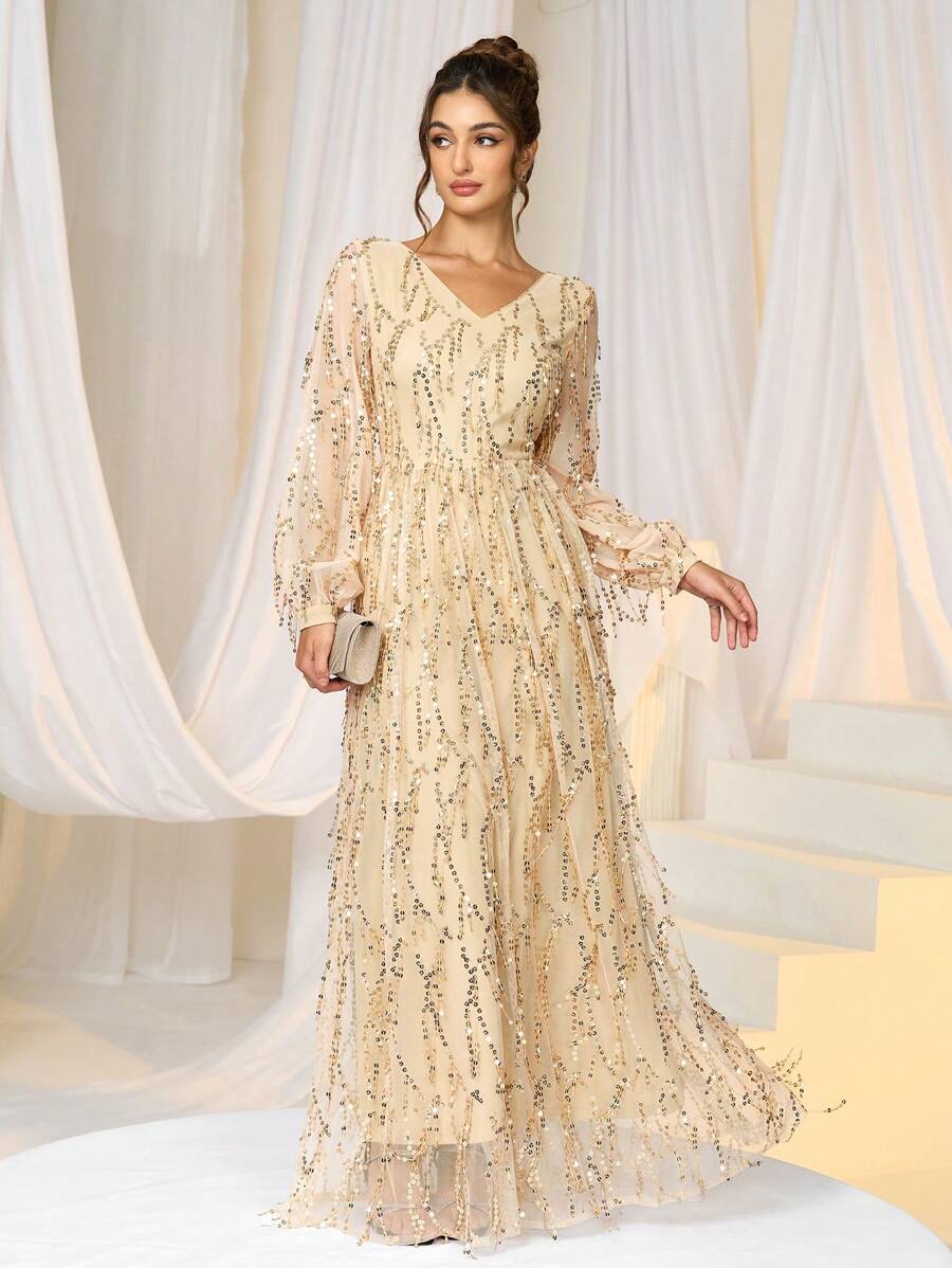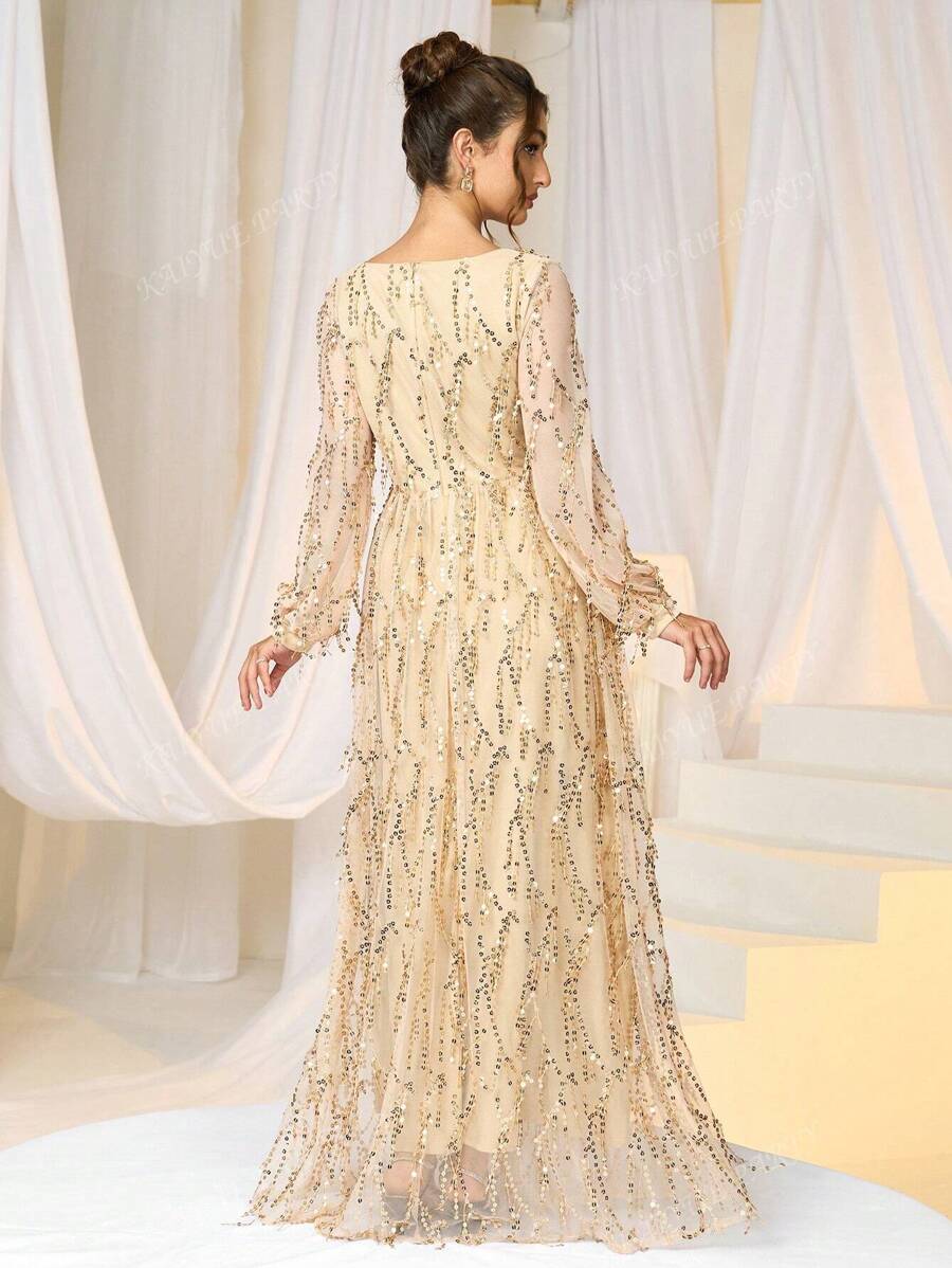 Women Elegant Sequin Lantern Sleeve Formal Evening Party Dress, Autumn