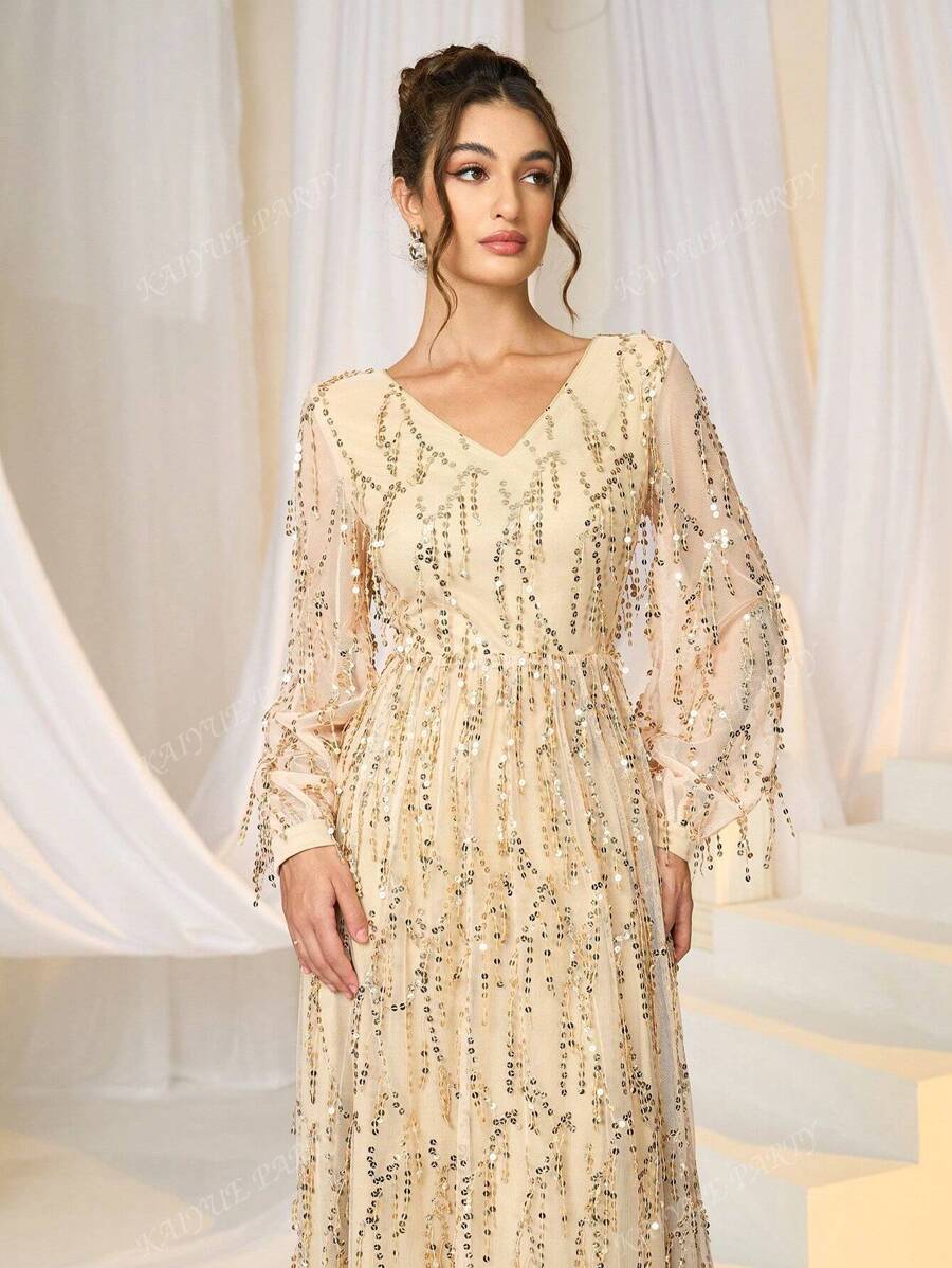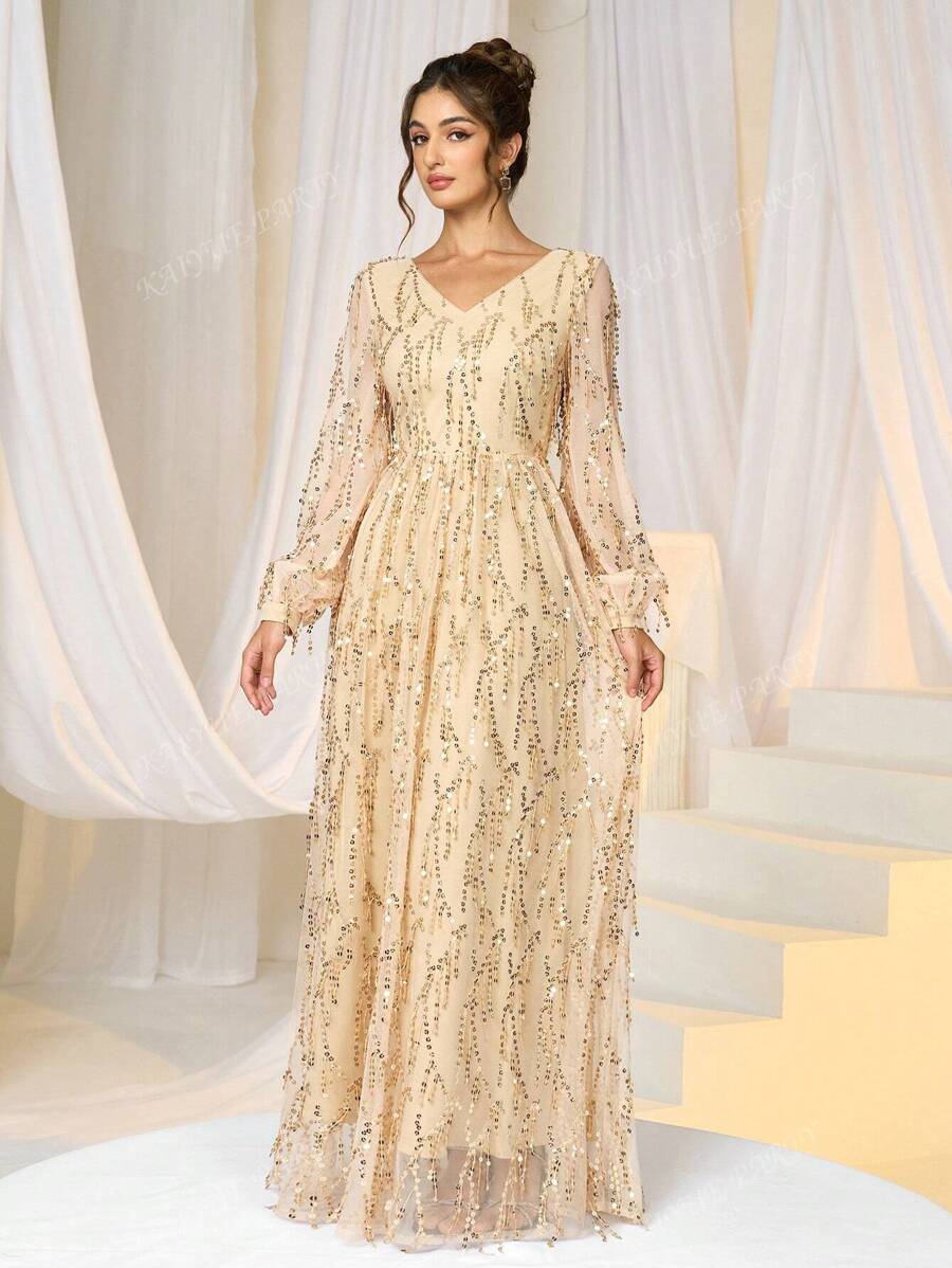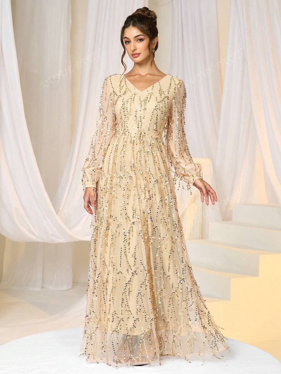 Women Elegant Sequin Lantern Sleeve Formal Evening Party Dress, Autumn