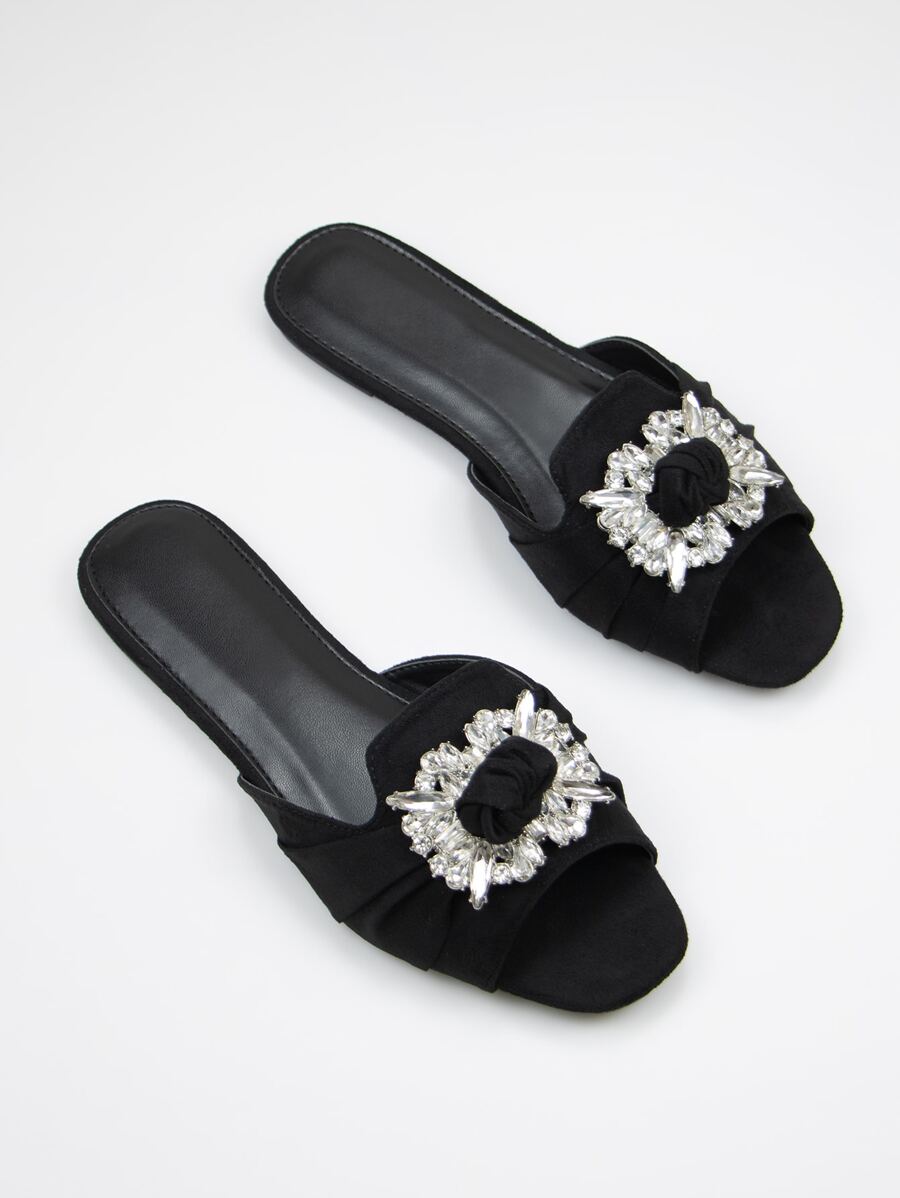 Women Rhinestone Decor Slide Sandals, Glamorous Faux Suede Open Toe Sandals Valentines