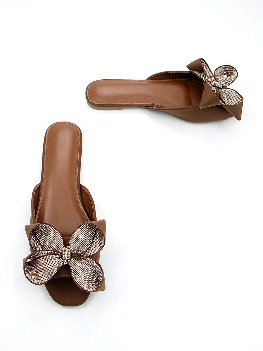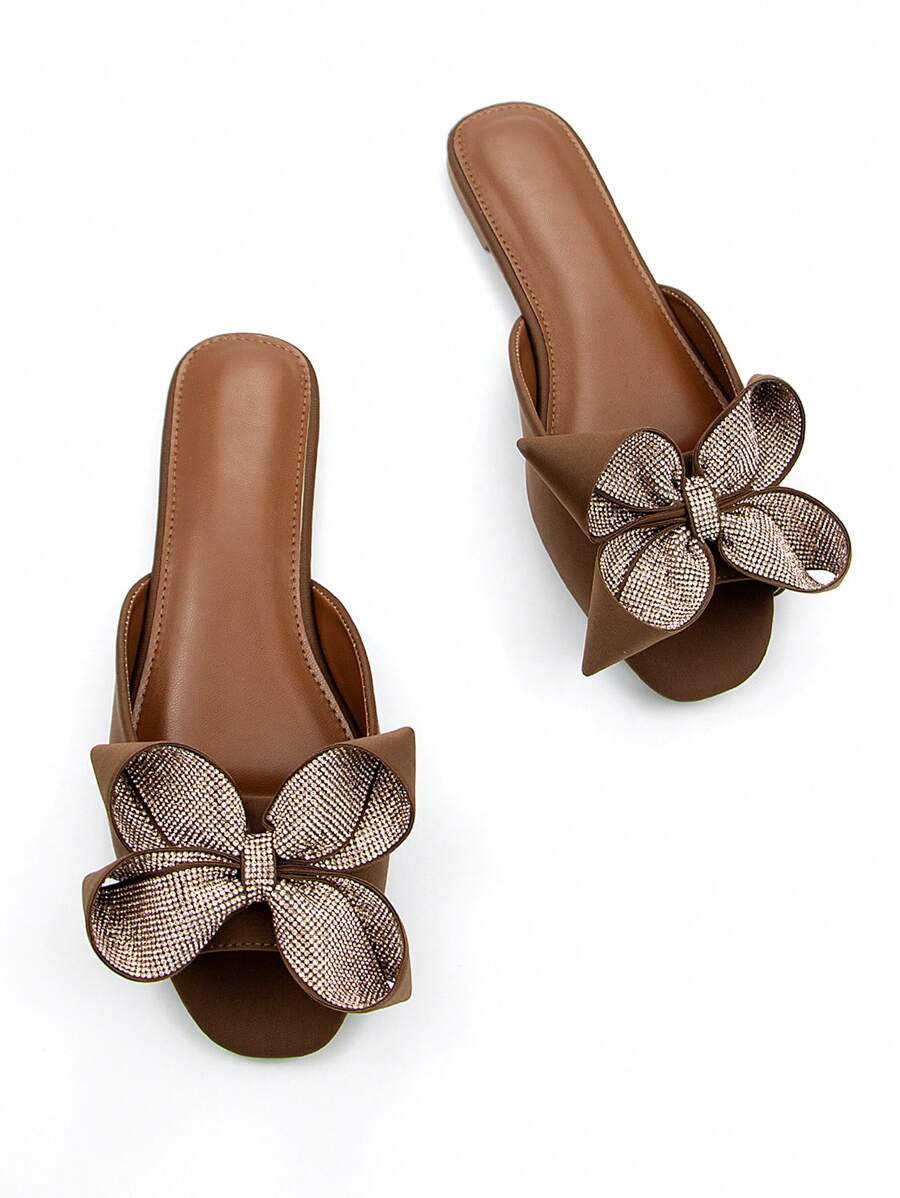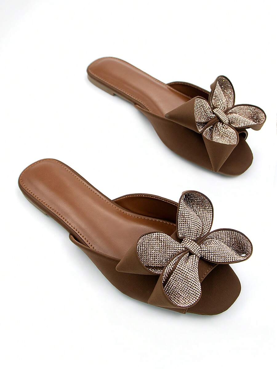 Women’s Elegant 3D Rhinestone Flower & Bow Decor Brown Lycra Fabric Fashion Square Toe Comfy Daily & Party Flat Mule Sandals