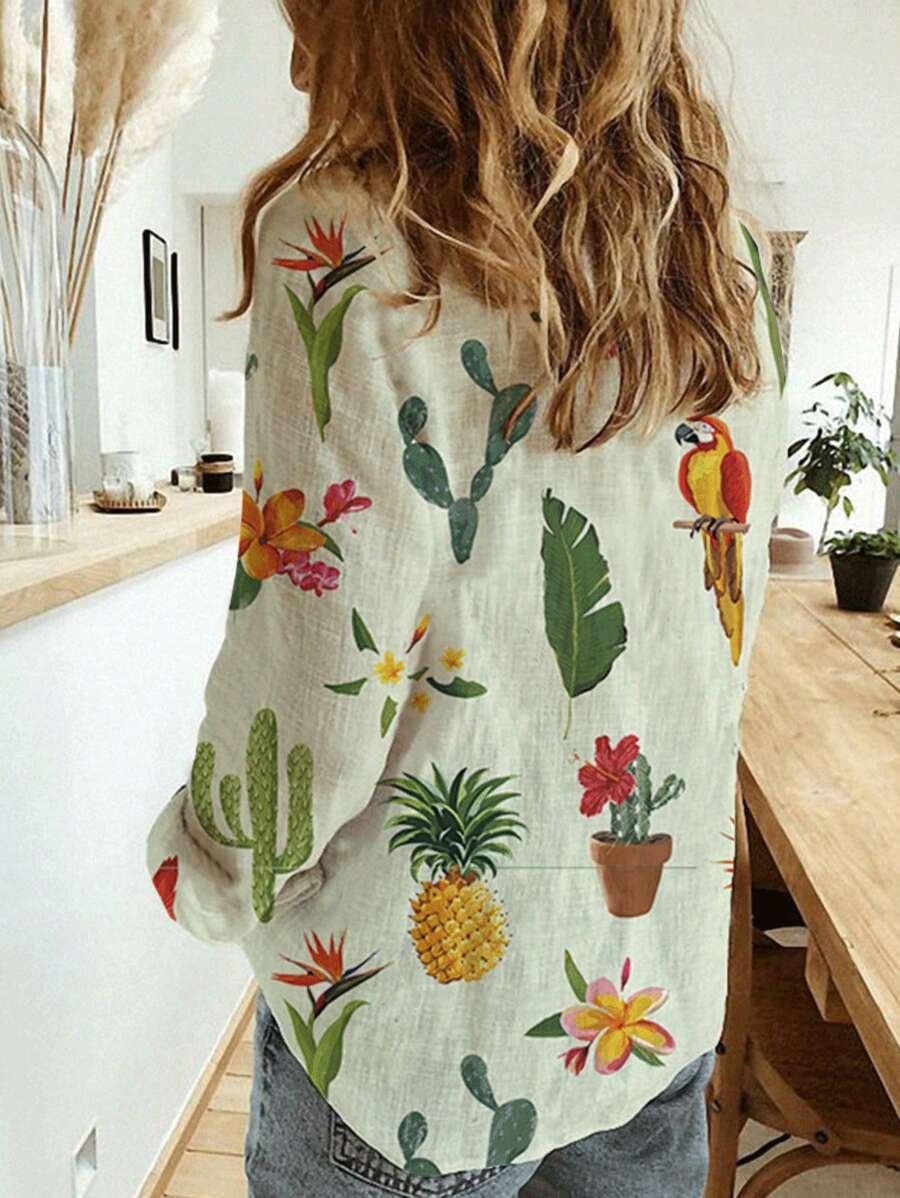 Women’s Fashion New Single-Breasted Long Sleeve Parrot, Pineapple, Cactus And Feather Print Shirt