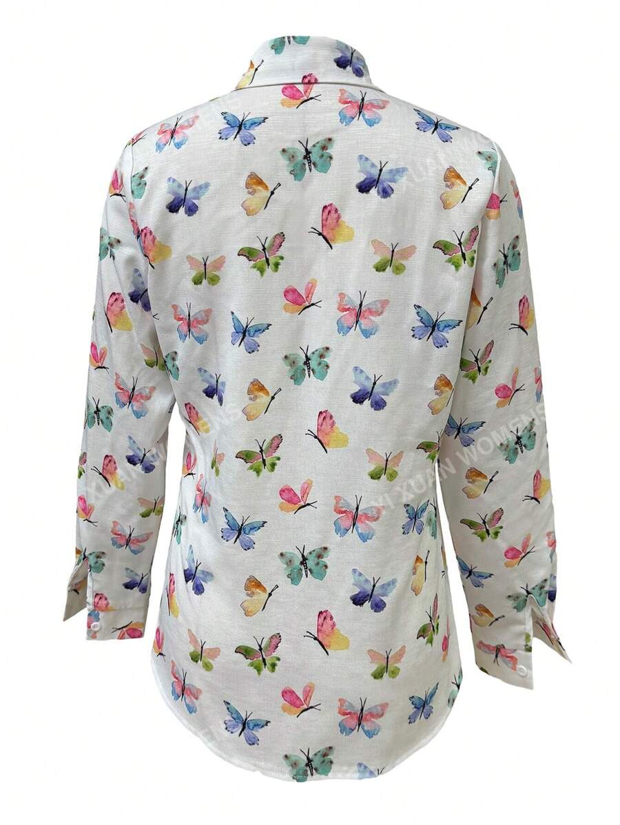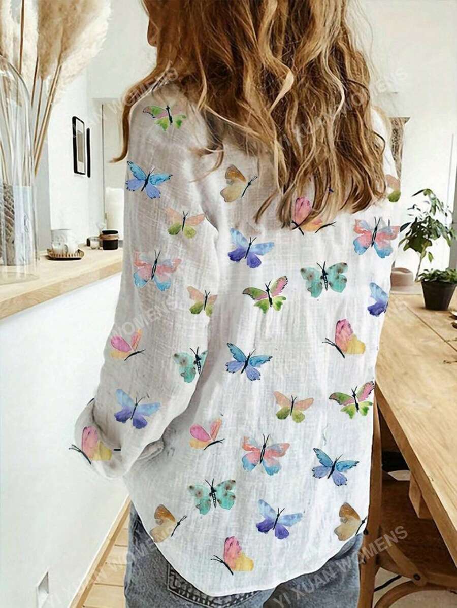 Women’s Shirts,Butterfly Print Long Sleeve Shirt For Spring & Summer – Casual Button Front Top With Stylish Design