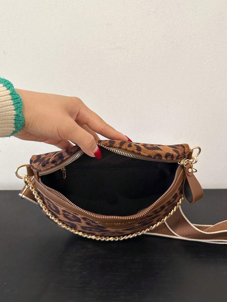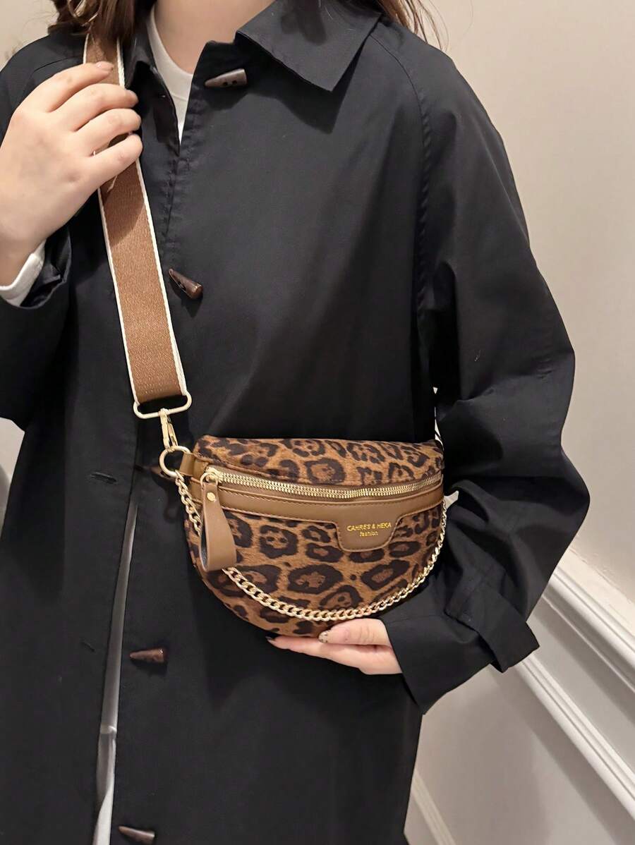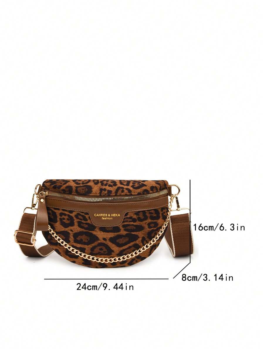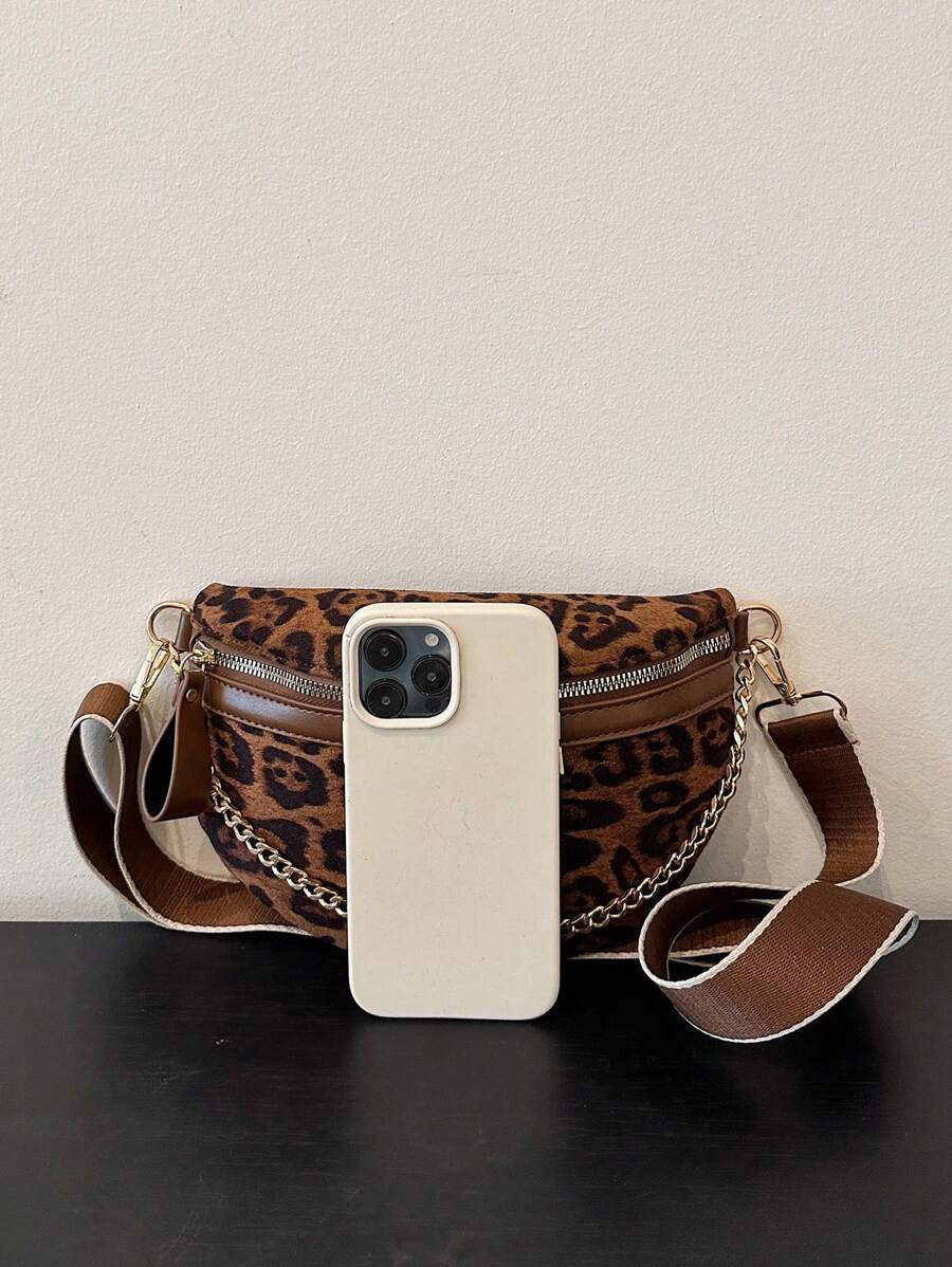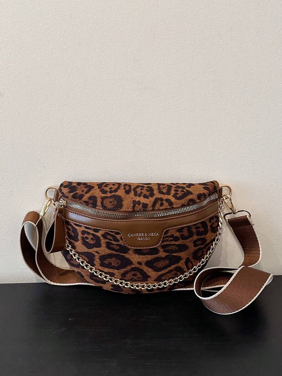 Y2k Style Chain & Leopard Print Retro Shoulder Strap Waist Bag With Distressed Details, Leopard Print Bag