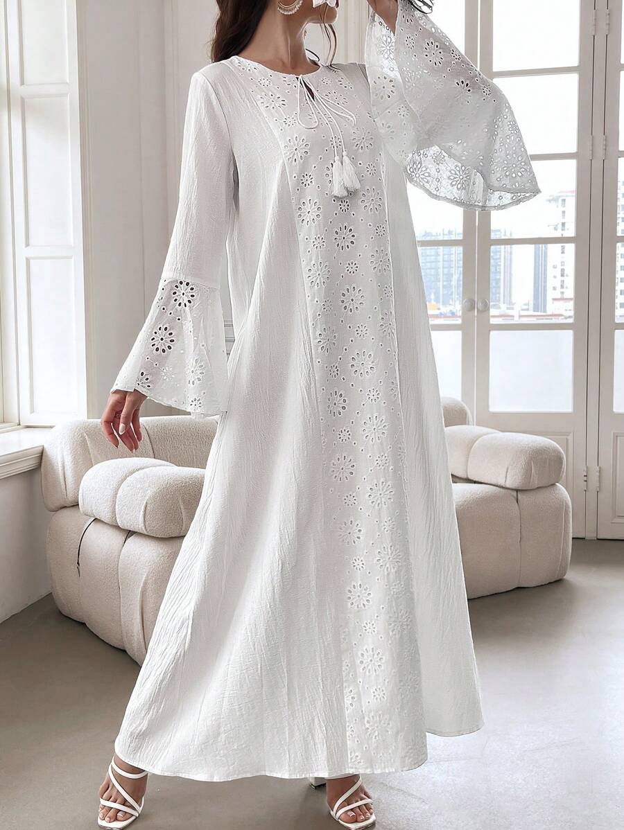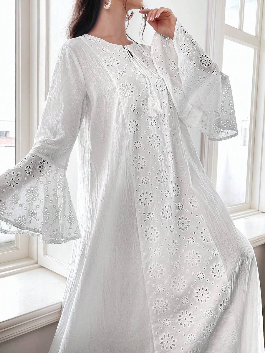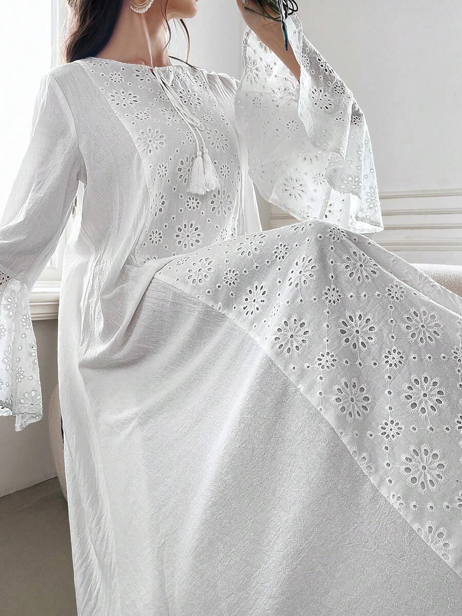 / Yasmyna Contrast Eyelet Embroidery Flare Sleeve Dress