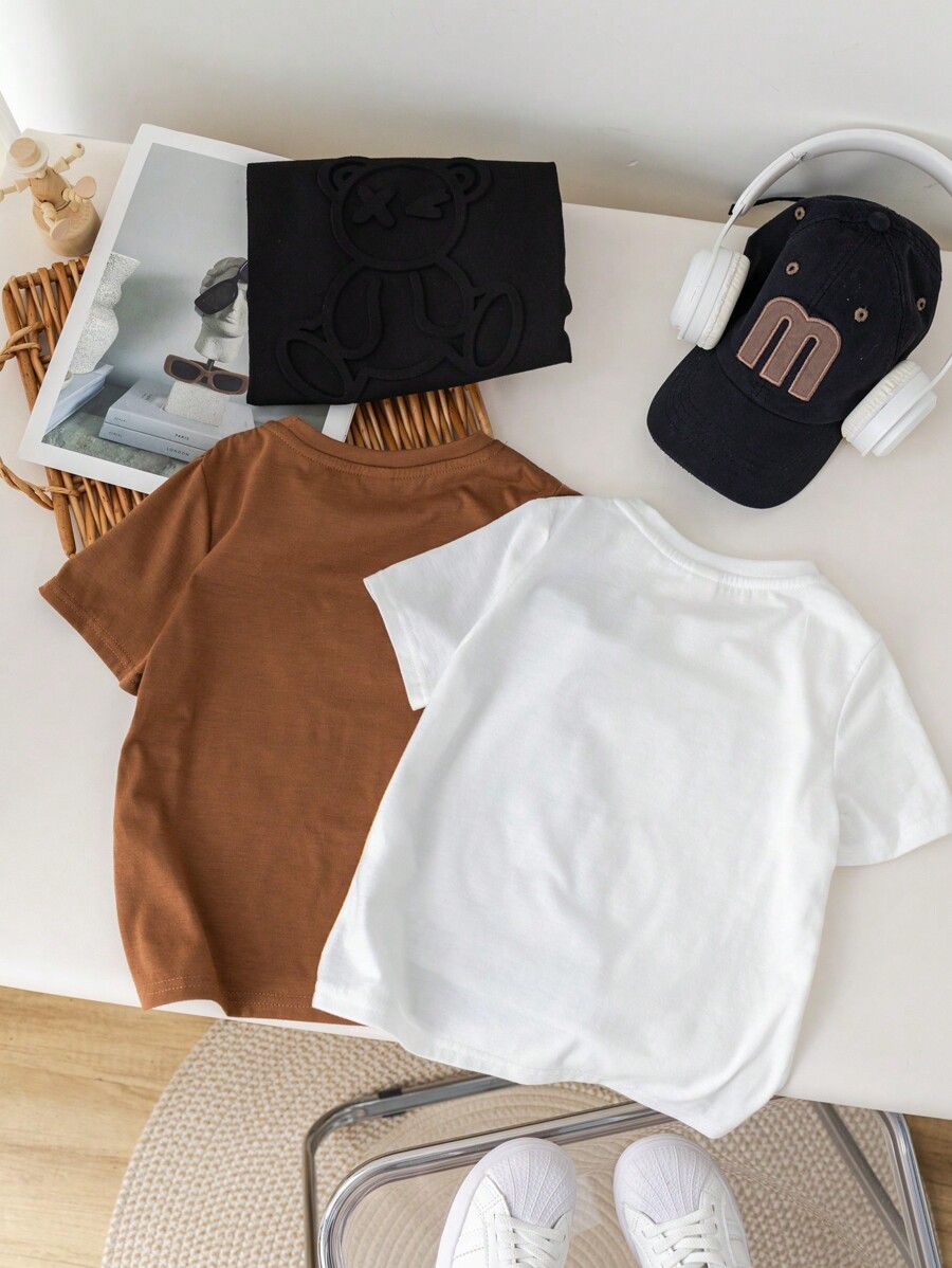 Young Boy Casual Korean Style 3D Embossed Lovely Fun Bear T-Shirt, Multi-Pack (3 Designs, 1 Piece Per Design), Summer Outfits