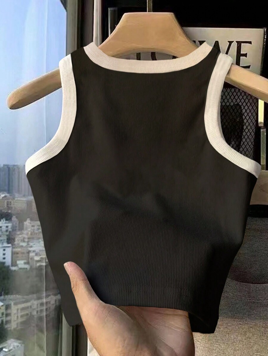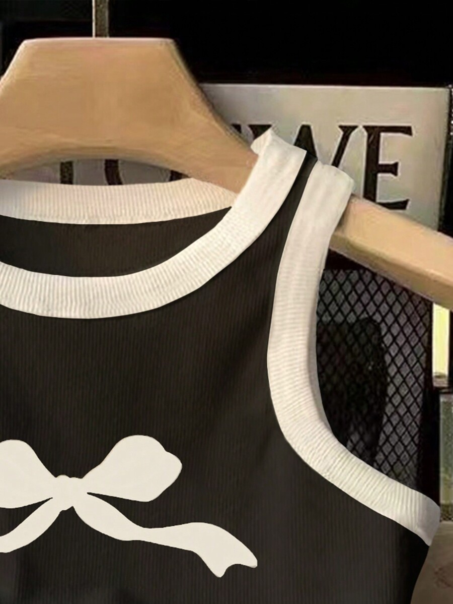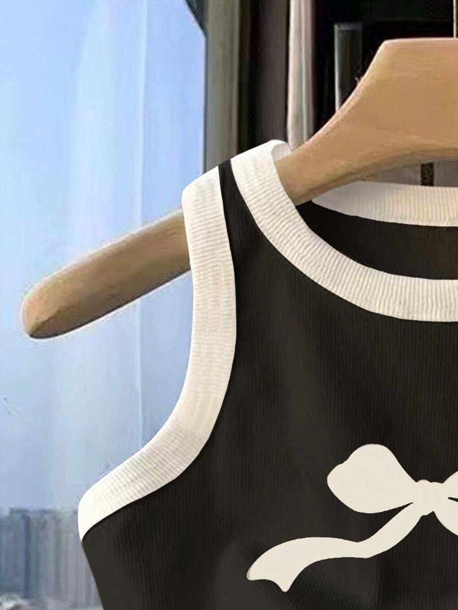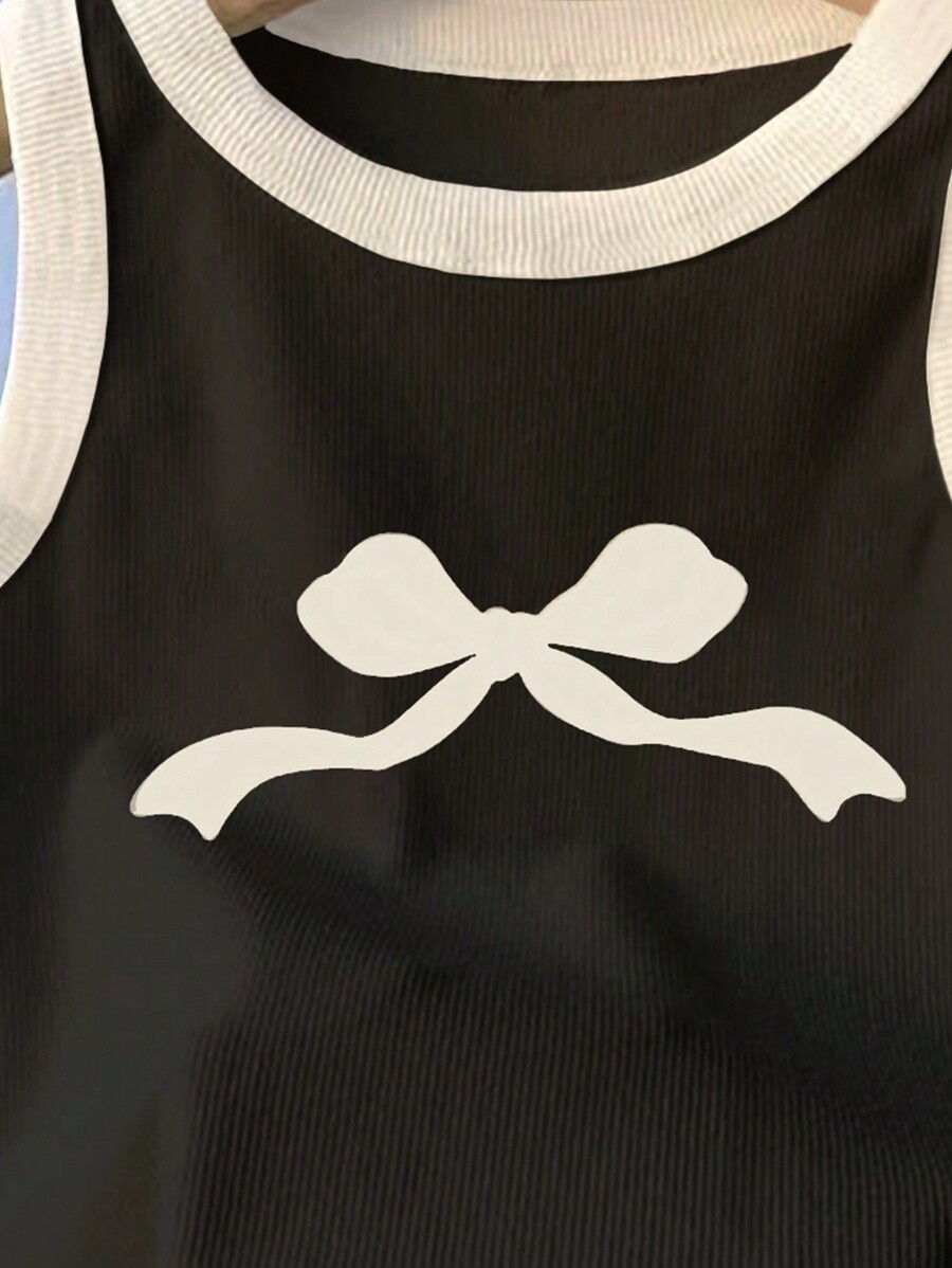 / Young Girl Bow Print Colorblock Round Neck Casual Vest